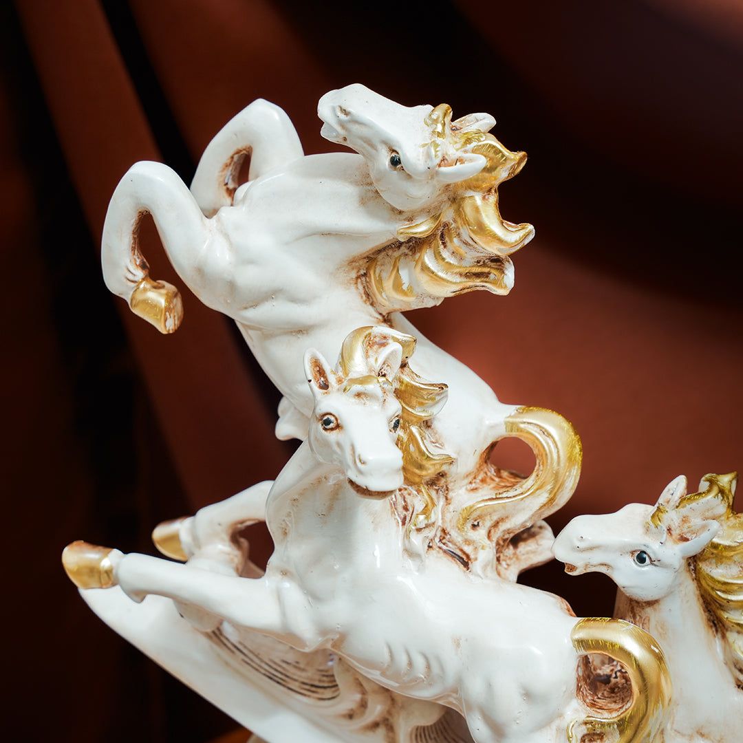 Featuring four majestic horses in a regal off-white and gold finish, this sculpture radiates opulence. The intricate carvings and details reflect masterful craftsmanship, making it a must-have for refined interiors.