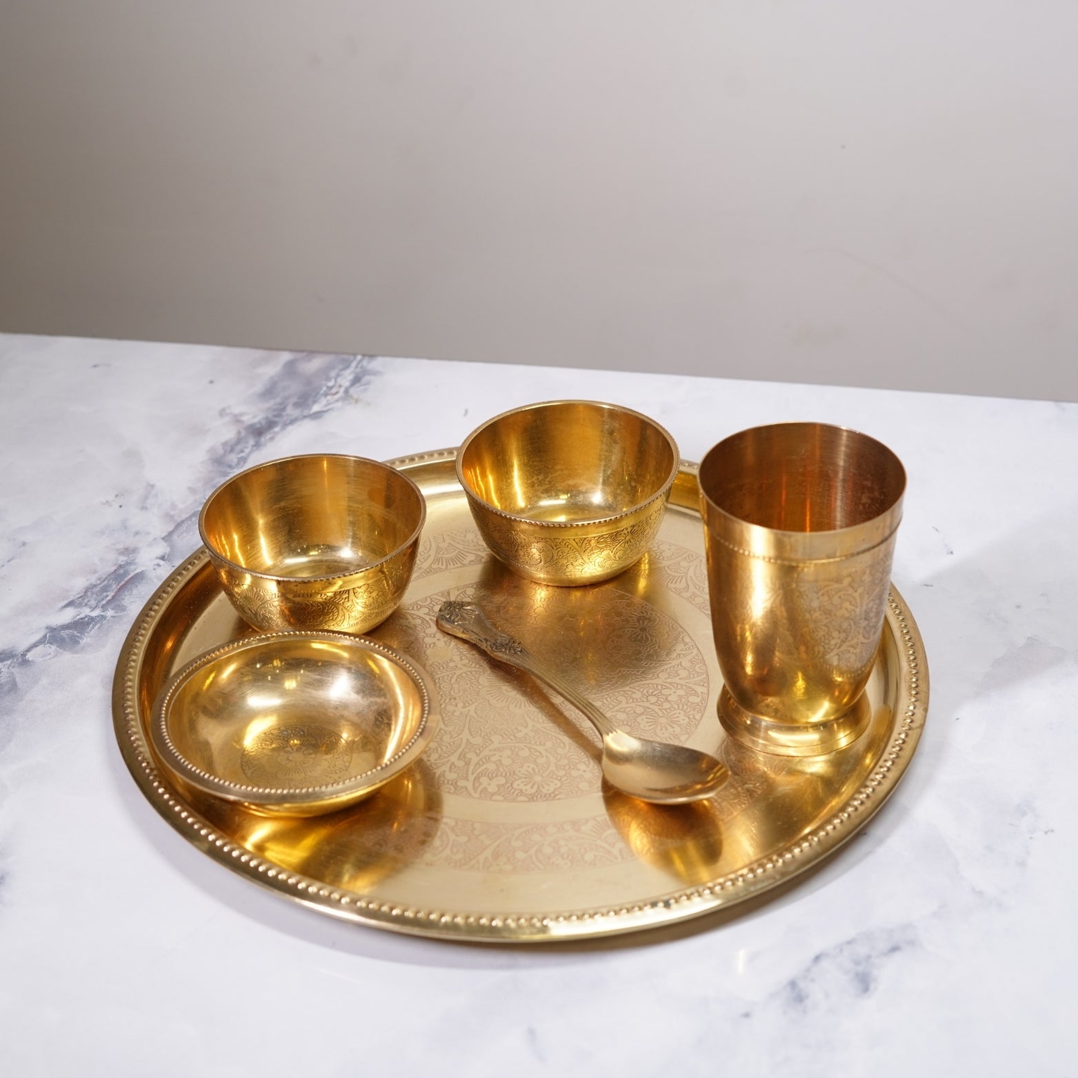Transform your dining experience with our Brass Plate Set, a perfect blend of timeless tradition and modern elegance. Crafted from high-quality brass, these plate Sets add sophistication to any table setting while offering practical benefits. The set includes one 12.0 Inches brass plate two brass katories , brass glass with height 5.0 inches with kalai, and one brass spoon, making it both a stylish and functional addition to your dining collection. Elevate your dining with our Brass Plate Set and enjoy the blend of tradition, durability, and elegance at your table The complete Plate Set is approximately 1500 Grams.