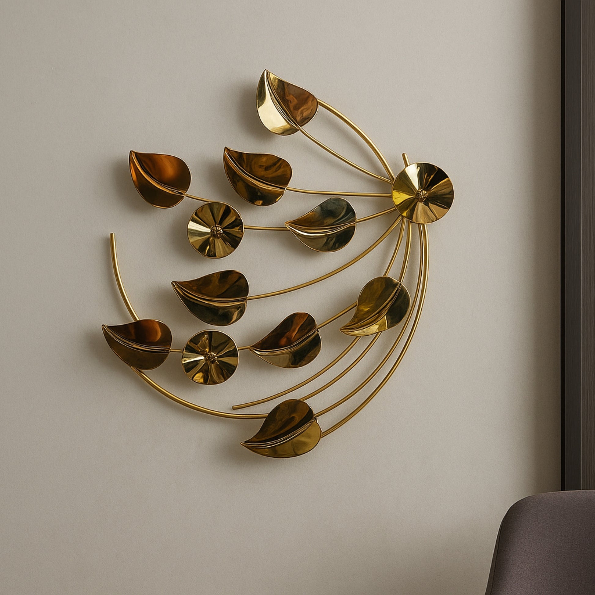 The Golden Harmony Luxe Metal Wall Art Set is a statement décor choice crafted for those who appreciate refined design. Each piece combines contemporary geometry with nature-inspired leaf motifs, finished in polished gold tones for a rich, radiant appeal. Arrange them together for a grand feature wall or place them individually for subtle sophistication. Ideal for premium interiors that demand both style and presence.
