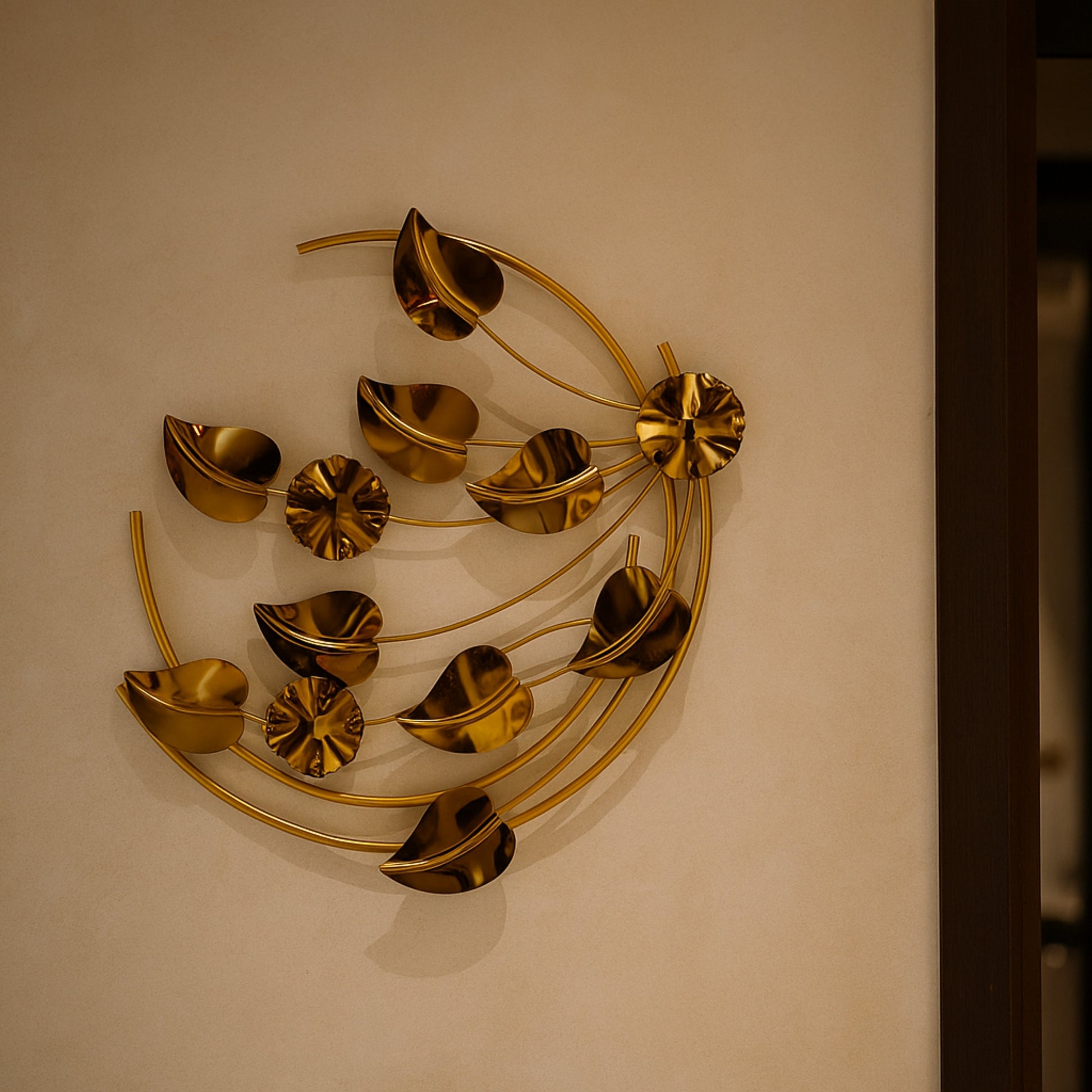 Enhance your interiors with the timeless charm of the Golden Harmony Wall Art. Featuring sleek metallic arcs and petal-like forms in a stunning golden finish, this set of three art pieces adds depth, elegance, and sophistication to any space. Perfect for premium living rooms, hallways, or luxury office interiors, it reflects modern artistry with a touch of opulence.