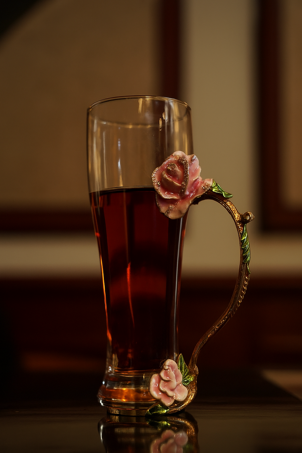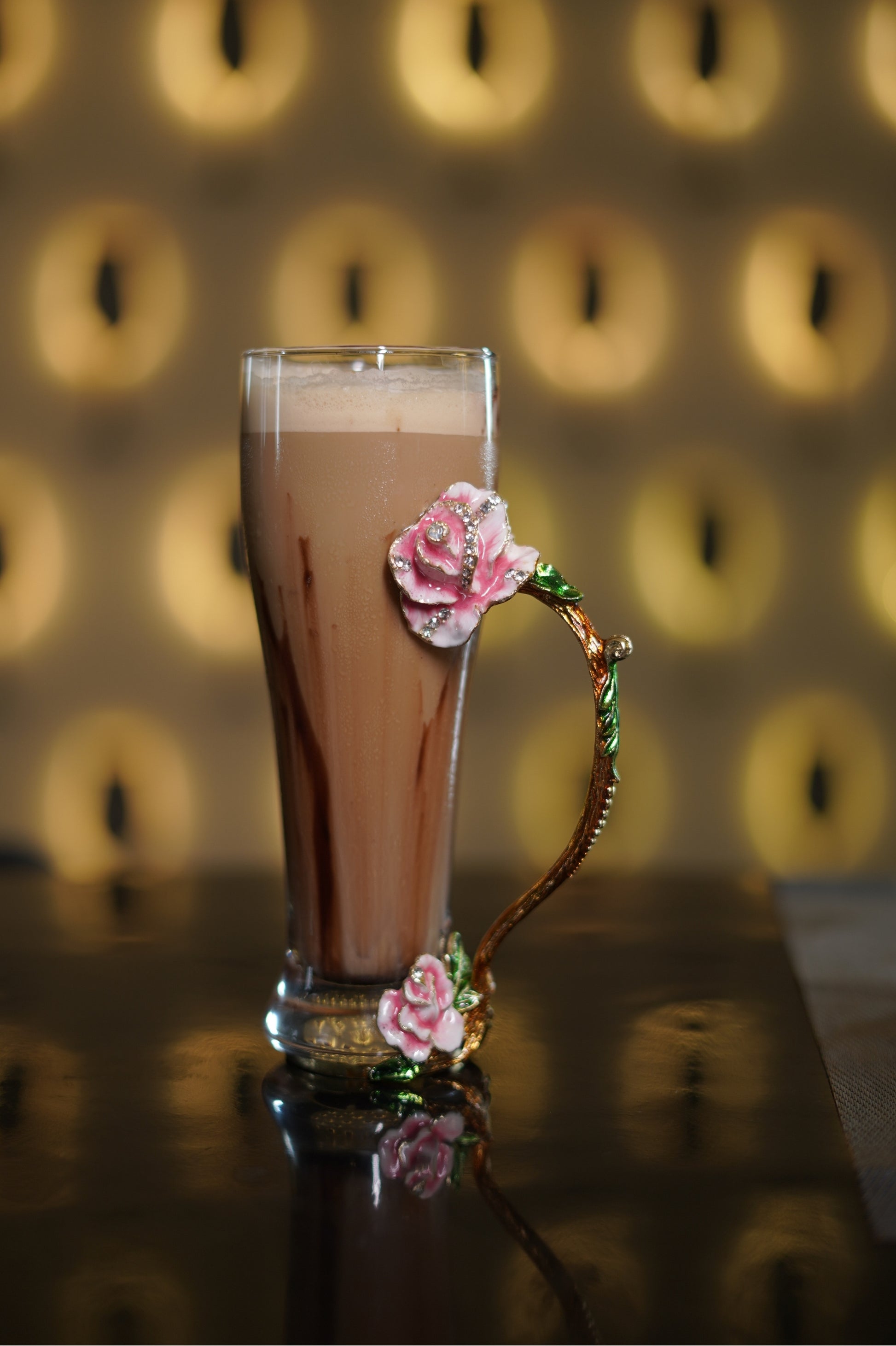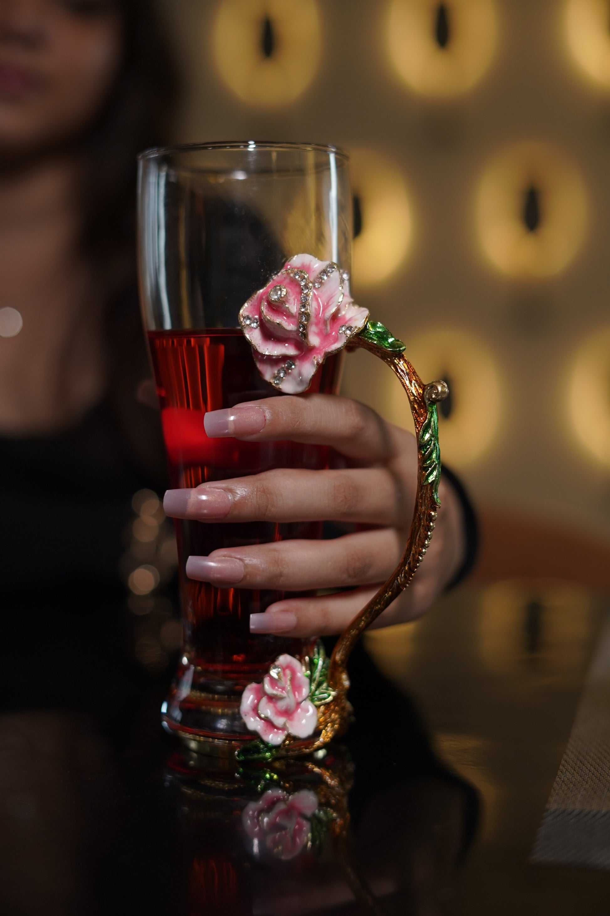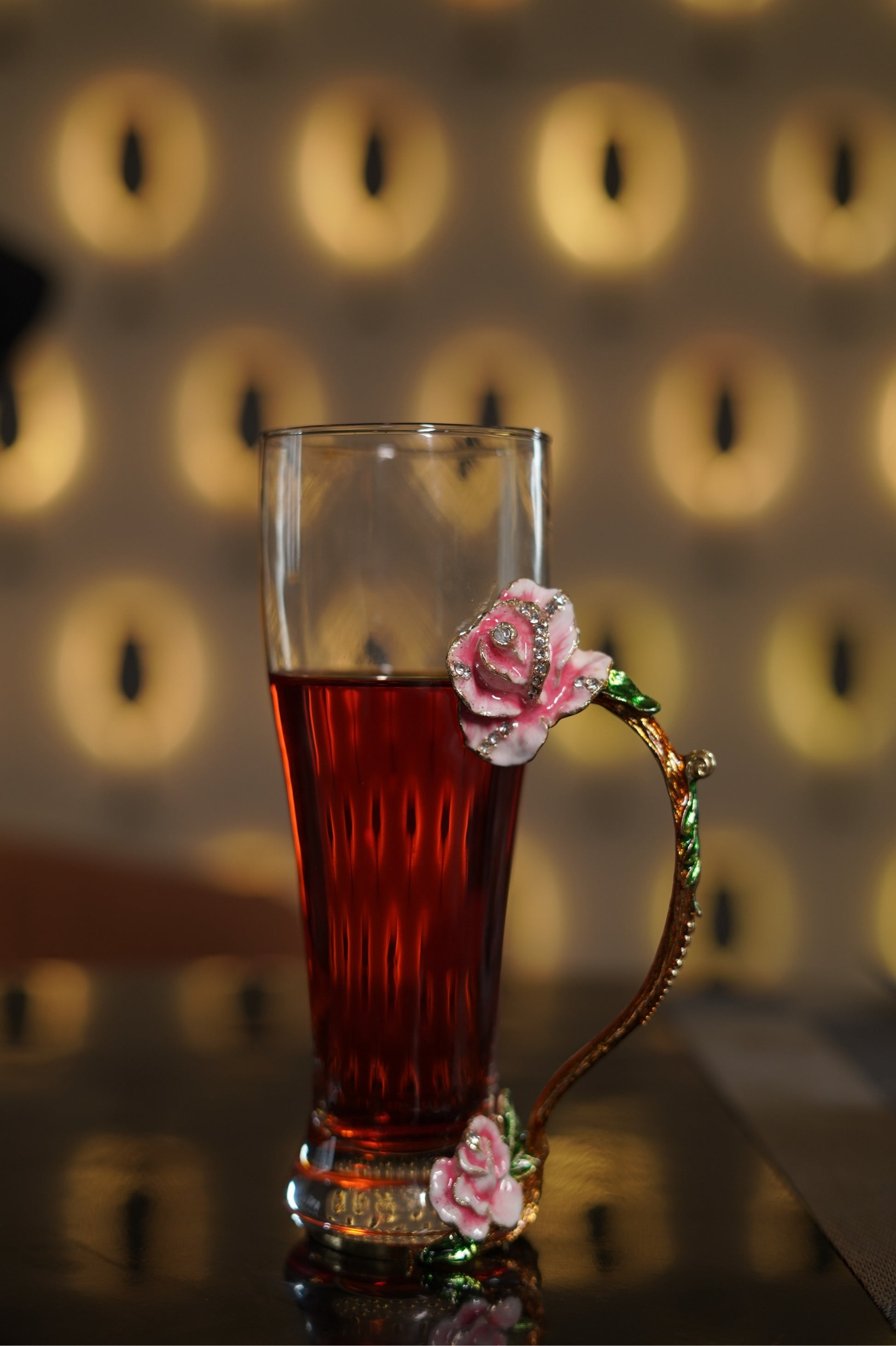 Sip in style with this exquisite rose-handle glass mug, where elegance meets artistry. The delicate floral design with jeweled detailing transforms every drink into a luxurious experience.