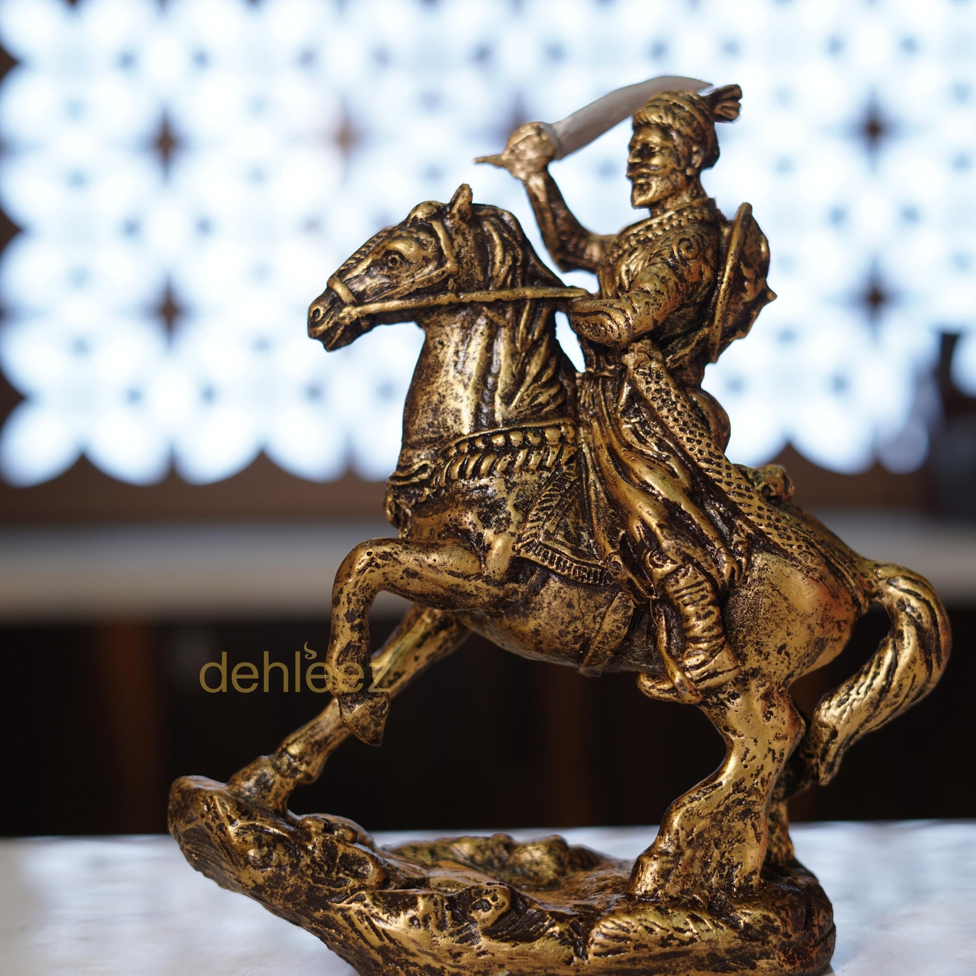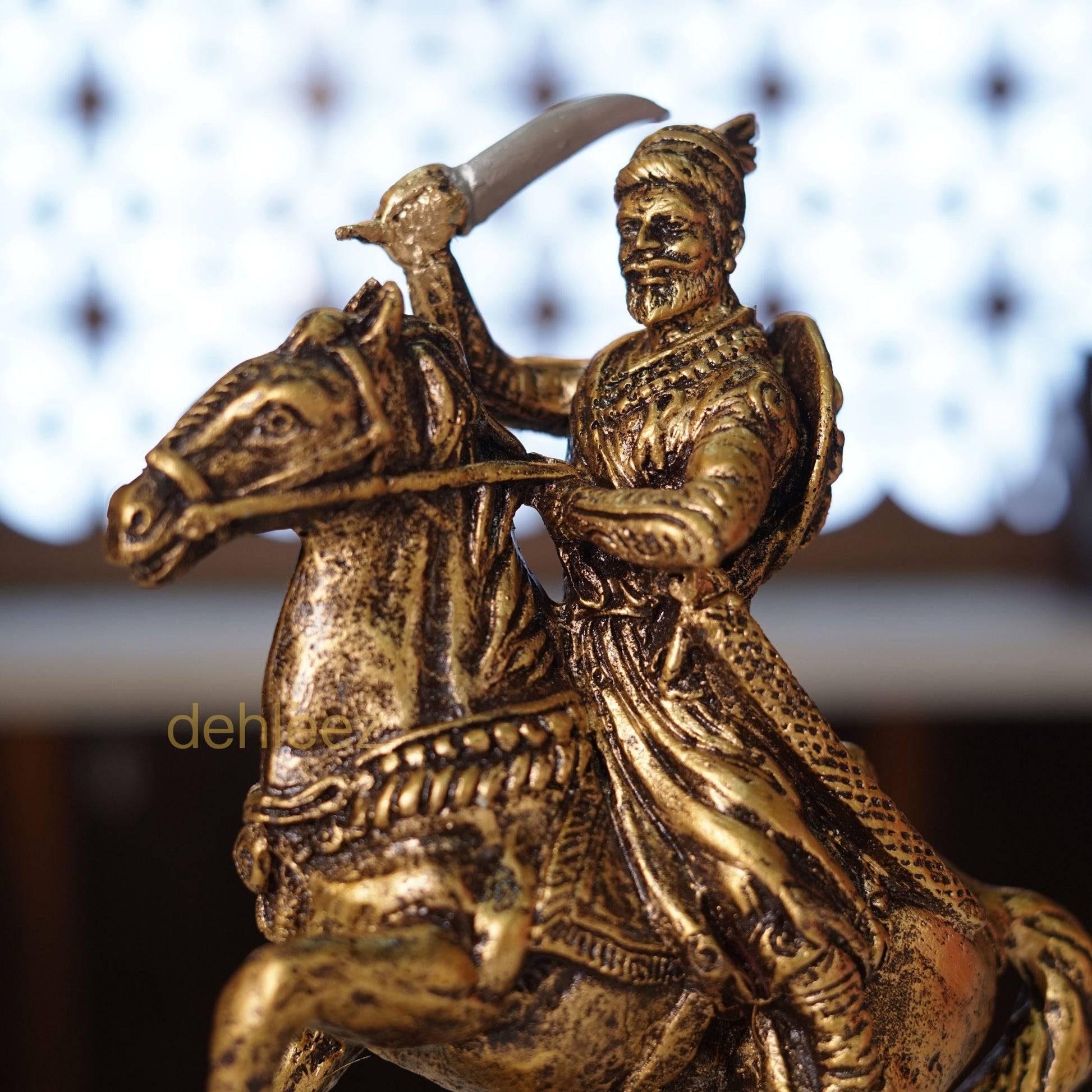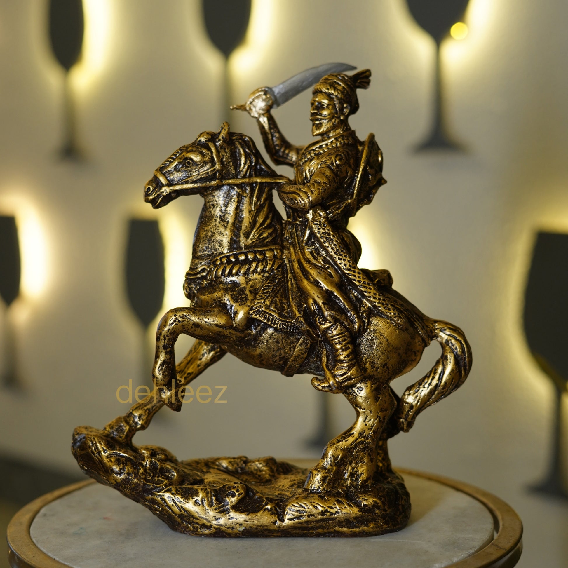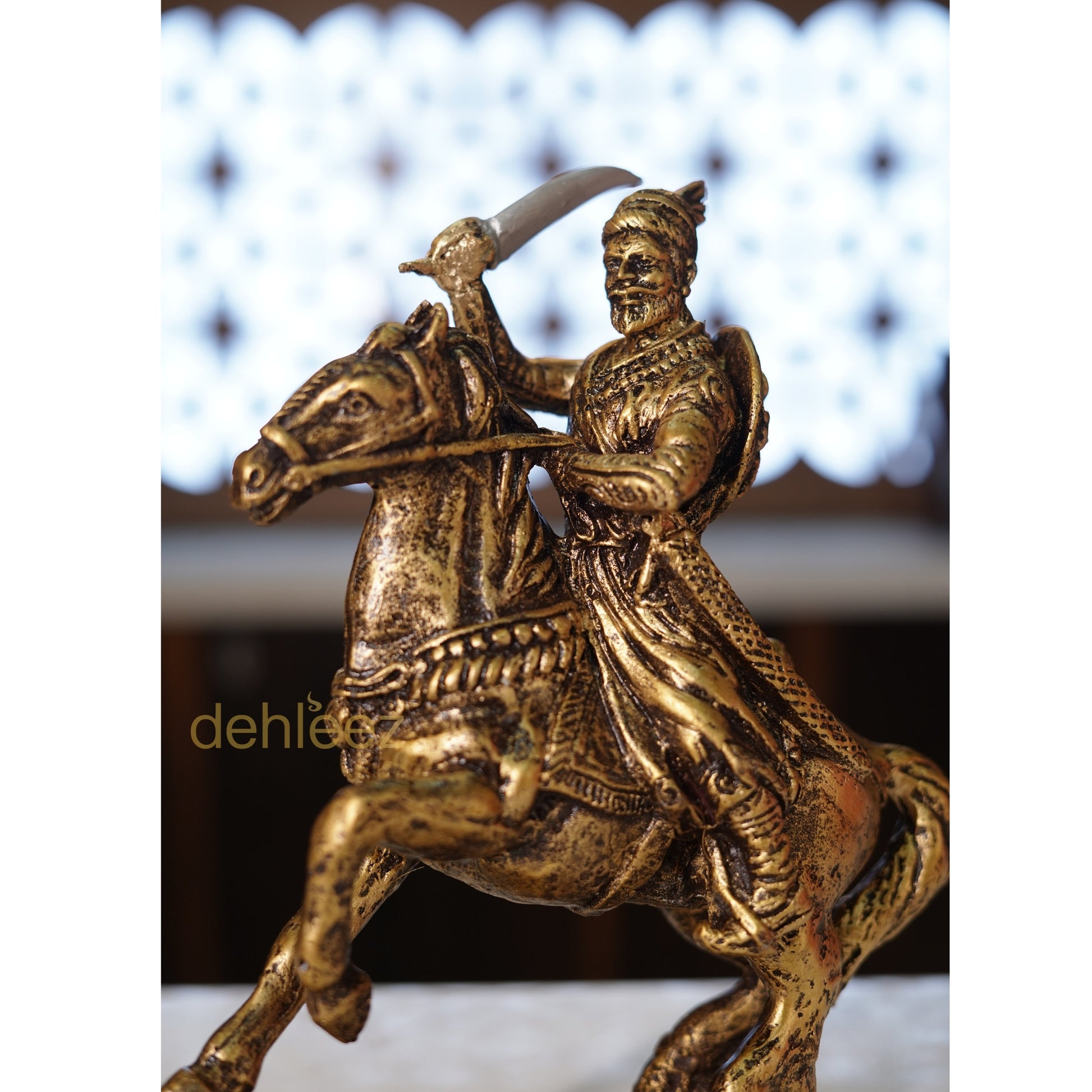 Expertly crafted in a striking antique gold finish, this sculpture captures the moment of triumph — Maharaj on his valiant horse, sword held high, ready to lead his people towards Swarajya.