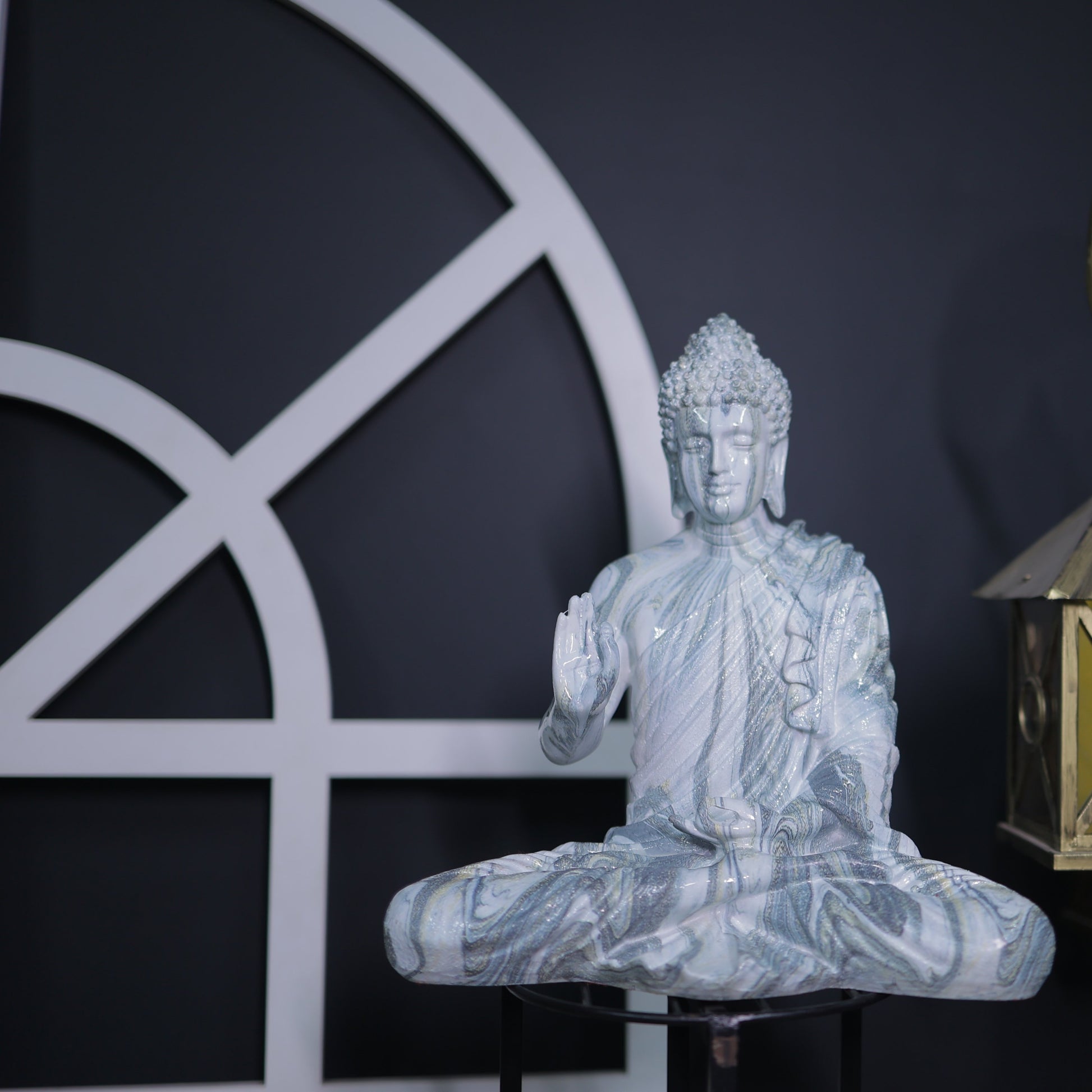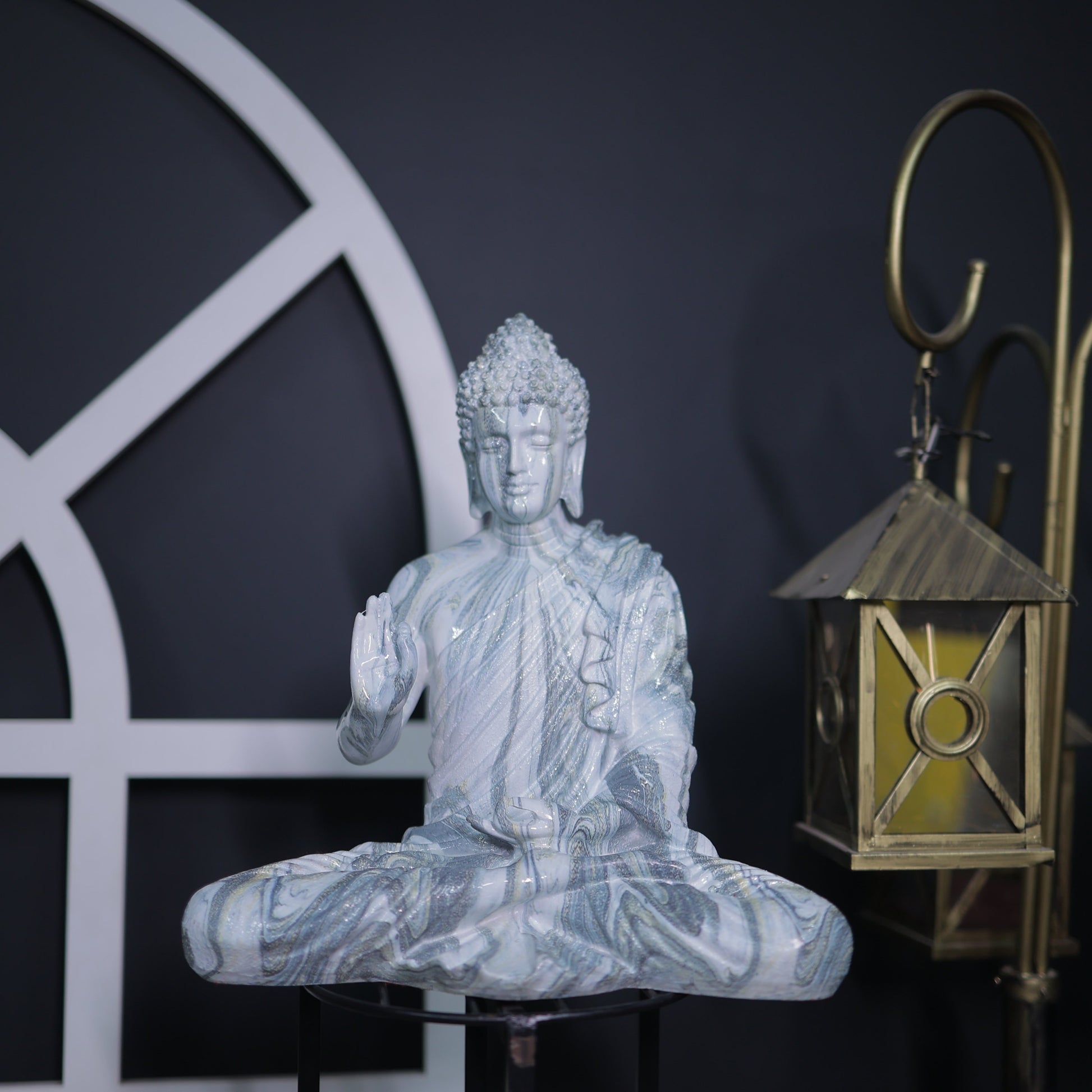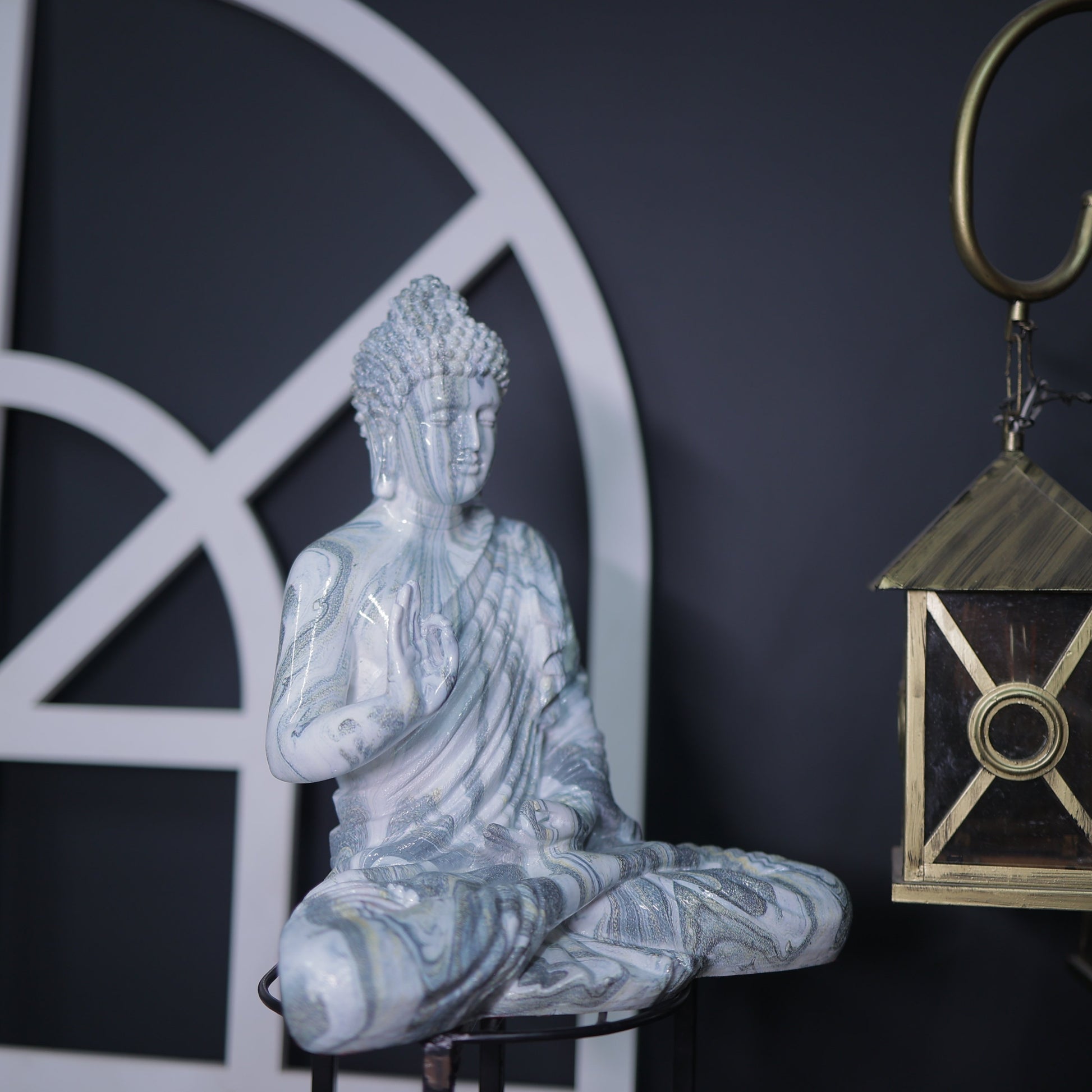 This 40cm white and black meditating Buddha statue is made of resin and is a beautiful and serene addition to any home decor. The Buddha is depicted in the lotus position, with one hand on his lap and the other raised near his shoulder height. This pose symbolizes enlightenment and peace. The statue is also a great representation of the Buddha's teachings on compassion and wisdom.